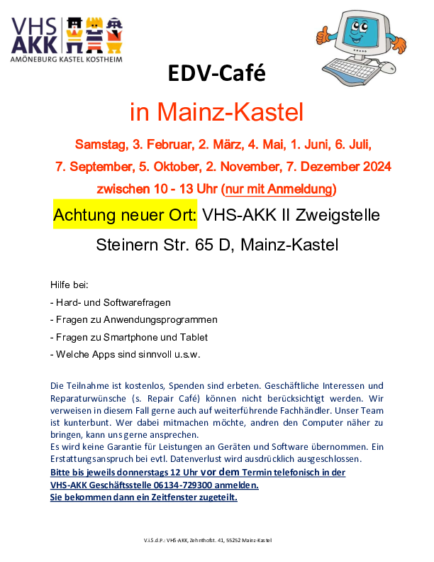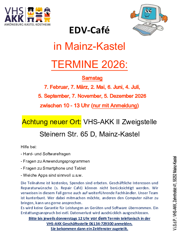 DI, MI, DO 9 bis 12 Uhr im Bürgerhaus Mainz-Kastel, Zehnthofstr. 41
