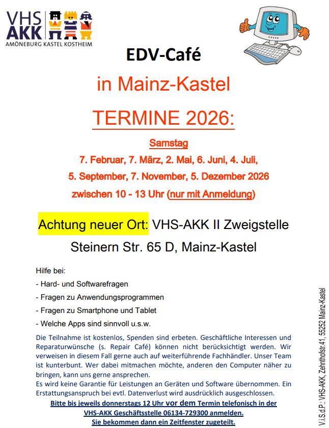 DI, MI, DO 9 bis 12 Uhr im Bürgerhaus Mainz-Kastel, Zehnthofstr. 41